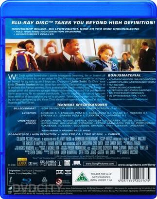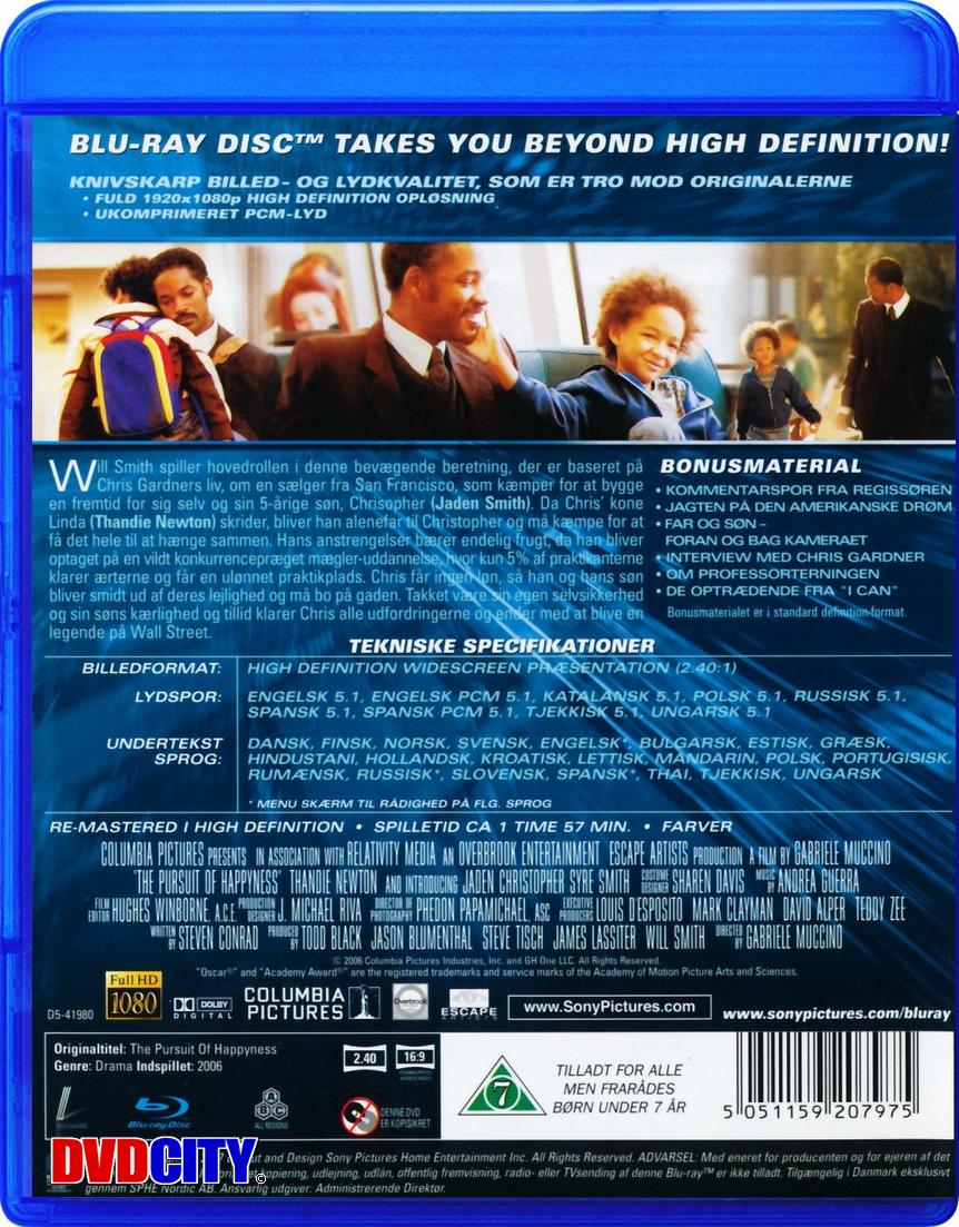 | Beskrivelse: [ Dansk Engelsk ] Det er den amerikanske drøm. Det er den menneskelige drøm. At man kan skabe sig en tilværelse, der er lykkelig for en selv og for sin familie. Chris Gardner har den drøm. Hans succes som sælger er begrænset, han bliver forladt af sin kone, han bliver sparket ud af sin lejlighed, og - værst af alt - han skal samtidig sikre sin femårige søn en tålelig tilværelse. Alligevel kaster han sin ud i at gennemgå en ulønnet uddannelse som mægler, hvor han i konkurrence med tyve andre kandidater kan se frem til en og kun en stilling i firmaet bagefter. Mens han trofast møder op i sin habit på jobbet hver dag, overlever han som han bedst kan med sin søn; sover på busstationer, på offentlige toiletter og - når de er heldige at få plads - på et herberg for hjemløse. Uden at lade det gå ud over sin søn satser Chris Gardner alt på at få sin drøm til at gå i opfyldelse. Beskrivelse: [ Dansk Engelsk ] For his son, One man will reach for the impossible. Will Smith stars in this moving tale inspired by a true story of Chris Gardner, a San Francisco salesman who's struggling to make ends meet. When his girlfriend Linda (Thandie Newton) walks out, Chris is left to raise their 5-year old son Christopher (Jaden Smith) on his own. Chris' determination finally pays off when he lands an unpaid internship in a brutally competitive stockbroker-training program, where only twenty interns will make the cut. But without a salary, Chris and his son are evicted from their apartment and are forced to sleep on the streets, in homeless shelters and even behind the locked doors of a metro station bathroom. With self confidence and the love and trust of his son, Chris Gardner rises above his obstacles to become a Wall Street legend. | Ekstra features: