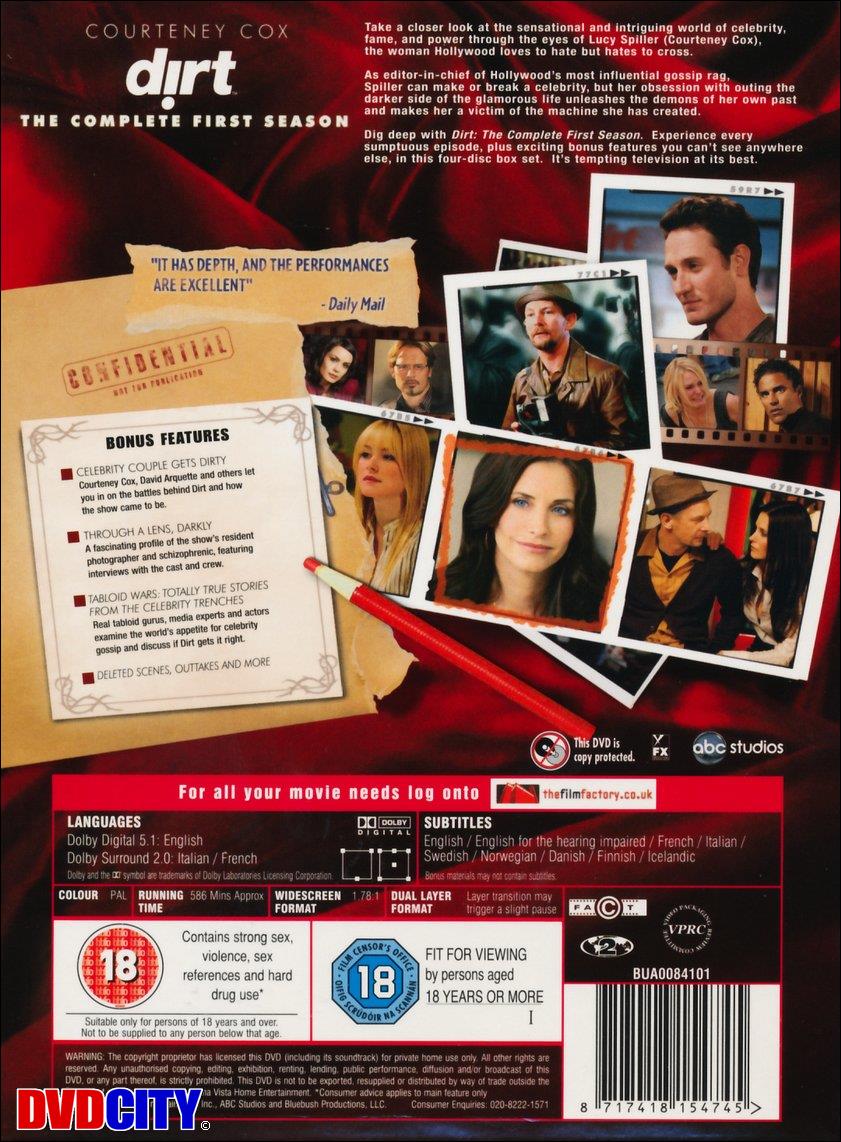 | Beskrivelse: [ Dansk Engelsk ] Få et nærmere kig ind i de kendtes verden. Se stjernerne, intrigerne og magten gennem Lucy Spillers (Courteney Cox) øjne, kvinden som Hollywood elsker at hade, men hader at møde. Som chefredaktør på Hollywoods mest indflydelsesrige sladder-blad, kan Spiller både skabe og knække en kendis. Men hendes hensynsløse jagt på saftige nyheder, lokker også dæmonerne fra hendes egen fortid frem, hvilket gør, at hun selv bliver offer for sit eget kyniske værk. Dirt - den komplette første sæson, graver dybt i skidtet. Oplev hvert afslørende afsnit, plus det spændende bonusmateriale, som du ikke finder andre steder end i denne 4-disc box. Mere "dirty" bliver det næppe. Beskrivelse: [ Dansk Engelsk ] Take a closer look at the sensational and intriguing world of celebrity, fame, and power through the eyes of Lucy Spiller (Courteney Cox), the woman Hollywood loves to hate but hates to cross. As editor-in-chief of Hollywoods most influential gossip rag, Spiller can make or break a celebrity, but her obsession with outing the darker side of the glamorous life unleashes the demons of her own past and makes her a victim of the machine she has created. Dig deep with Dirt: The Complete First Season. Experience every sumptuous episode, plus exciting bonus features you cant see anywhere else, in this four-disc box set. Its tempting television at its best.