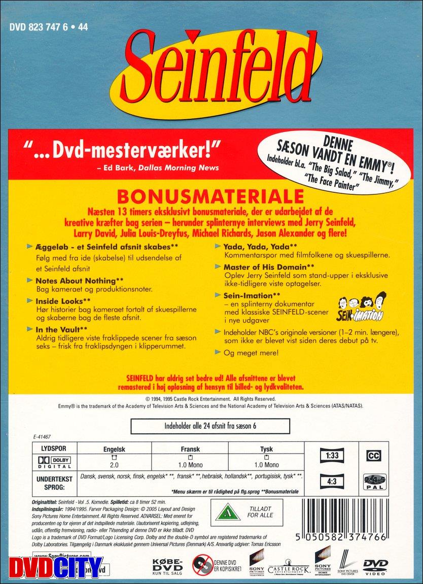 | Beskrivelse: [ Dansk Engelsk ] Et show, der handler om ingenting! Hvordan kan det blive morsomt? Jo, når manden bag det hele hedder Jerry Seinfeld, er succes'en sikret. Gennem 9 sæsoner glædede Jerry Seinfeld hele verden med sine betragtninger over hverdagslivet i den måske bedste komedieserie nogensinde.