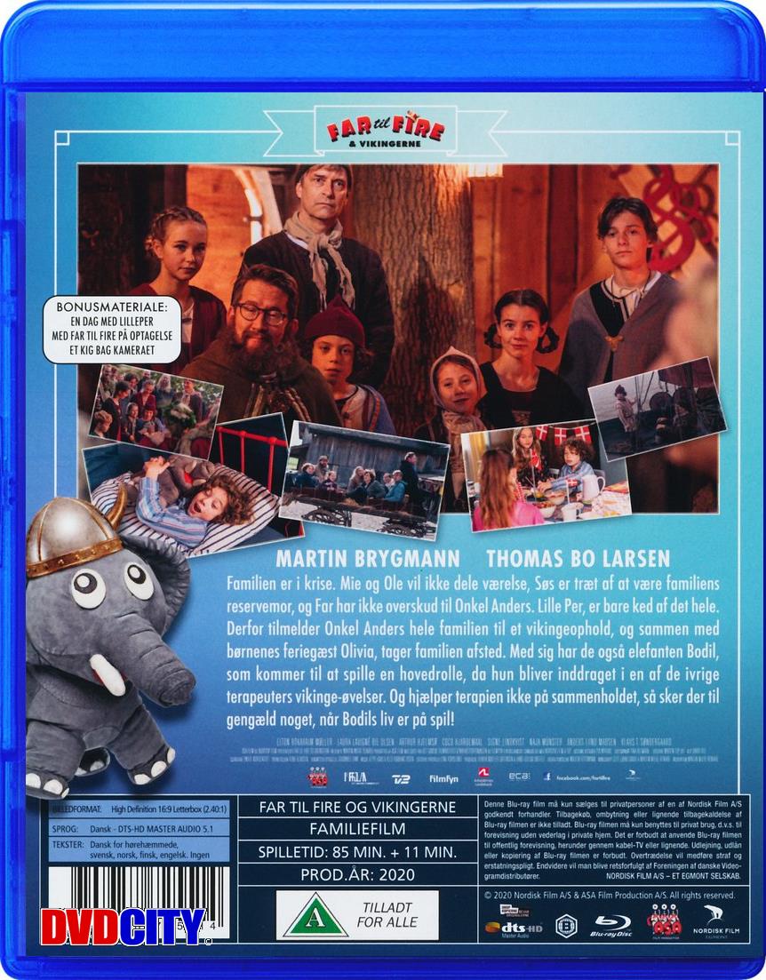Familiefilmen "Far til fire og vikingerne" er fortsættelsen til Far til fire på toppen og Far til fire i solen. Bodil har fødselsdag. Men alt er alligevel ikke godt i, den ellers sammentømrede famillien. Søs er træt af at være reservemor for sine søskende, og skulle stå for alt, der hedder husholdning. Søskende Mia og Ole, kan ikke længere holde ud at dele værelse. Far har ikke overskud til at håndtere Onkel Anders' opførsel. Det efterlader Lille Per, i midten af det hele. For at bryde med familiens disharmoni, tilmelder Onkel Anders derfor familien til et ophold på et familieterapisted. I en vikingelandsby. I selskab med børnenes feriegæst Olivia, tager familien afsted for at få styr på tingene. Med sig har de selvfølgelig også elefanten Bodil, hele familiens gamle krammedyr, som pludselig kommer til at spille en hovedrolle, da hun bliver inddraget i en af de ivrige terapeuters selvopfundne vikinge-øvelser. Og hjælper terapien ikke på sammenholdet, så sker der til gengæld noget, når det er Bodils liv der er på spil! |