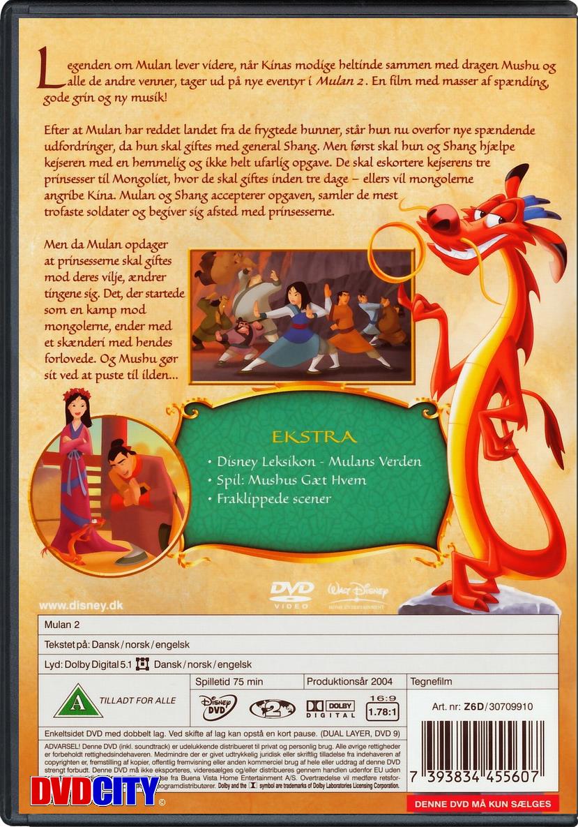 | Beskrivelse: [ Dansk Engelsk ] Legenden om Mulan lever videre, når Kinas modige heltinde sammen med dragen Mushu og alle de andre venner, tager ud på nye eventyr i Mulan 2. En film med masser af spænding, gode grin og ny musik! Efter at Mulan har reddet landet fra de frygtede hunner, står hun nu overfor nye spændende udfordringer, da hun skal giftes med general Shang. Men først skal hun og Shang hjælpe kejseren med en hemmelig og ikke helt ufarlig opgave. De skal eskortere kejserens tre prinsesser til Mongoliet, hvor de skal giftes inden tre dage – ellers vil mongolerne angribe Kina. Mulan og Shang accepterer opgaven, samler de mest trofaste soldater og begiver sig afsted med prinsesserne. Men da Mulan opdager, at prinsesserne skal giftes mod deres vilje, ændrer tingene sig. Det, der startede som en kamp mod mongolerne, ender med et skænderi med hendes forlovede. Og Mushu gør sit ved at puste til ilden...
