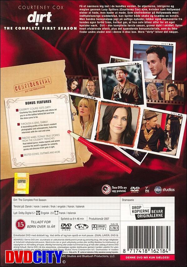 | Beskrivelse: [ Dansk Engelsk ] Få et nærmere kig ind i de kendtes verden. Se stjernerne, intrigerne og magten gennem Lucy Spillers (Courteney Cox) øjne, kvinden som Hollywood elsker at hade, men hader at møde. Som chefredaktør på Hollywoods mest indflydelsesrige sladder-blad, kan Spiller både skabe og knække en kendis. Men hendes hensynsløse jagt på saftige nyheder, lokker også dæmonerne fra hendes egen fortid frem, hvilket gør, at hun selv bliver offer for sit eget kyniske værk. Dirt - den komplette første sæson, graver dybt i skidtet. Oplev hvert afslørende afsnit, plus det spændende bonusmateriale, som du ikke finder andre steder end i denne 4-disc box. Mere "dirty" bliver det næppe. Beskrivelse: [ Dansk Engelsk ] Take a closer look at the sensational and intriguing world of celebrity, fame, and power through the eyes of Lucy Spiller (Courteney Cox), the woman Hollywood loves to hate but hates to cross. As editor-in-chief of Hollywoods most influential gossip rag, Spiller can make or break a celebrity, but her obsession with outing the darker side of the glamorous life unleashes the demons of her own past and makes her a victim of the machine she has created. Dig deep with Dirt: The Complete First Season. Experience every sumptuous episode, plus exciting bonus features you cant see anywhere else, in this four-disc box set. Its tempting television at its best.