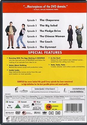 Beskrivelse: [ Dansk Engelsk ] Stand-up comedian Jerry Seinfeld stars in this innovative, half-hour series which blends situation comedy with his own stand-up routines. Seinfeld and writer Larry David have created an intriguing, refreshing view of single adulthood by tapping into the comedian's mind and revealing how real events and problems, such as male friendship, romance, careers and sporting endeavors, find their way into his on-stage comedy act. The series co-stars Tony Award winner Jason Alexander as George -- Jerry's shirt-off-the-back, go the extra-mile, anything for a pal, but please love me, please love me best friend. Saturday Night Live alumni Julia Louise-Dreyfus as Elaine -- Jerry's purely platonic, but still very close ex-girlfriend; and Michael Richards stars as Kramer, Jerry's slightly off-the wall, but not quite over the edge, neighbor, who is as devoted to him as a roadie is to a musician. | Ekstra features: