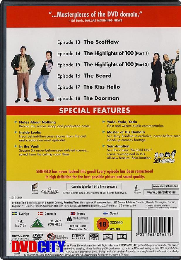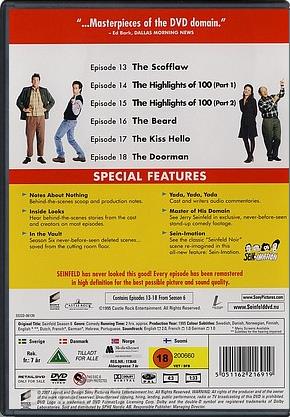 Beskrivelse: [ Dansk Engelsk ] Stand-up comedian Jerry Seinfeld stars in this innovative, half-hour series which blends situation comedy with his own stand-up routines. Seinfeld and writer Larry David have created an intriguing, refreshing view of single adulthood by tapping into the comedian's mind and revealing how real events and problems, such as male friendship, romance, careers and sporting endeavors, find their way into his on-stage comedy act. The series co-stars Tony Award winner Jason Alexander as George -- Jerry's shirt-off-the-back, go the extra-mile, anything for a pal, but please love me, please love me best friend. Saturday Night Live alumni Julia Louise-Dreyfus as Elaine -- Jerry's purely platonic, but still very close ex-girlfriend; and Michael Richards stars as Kramer, Jerry's slightly off-the wall, but not quite over the edge, neighbor, who is as devoted to him as a roadie is to a musician. | Ekstra features: