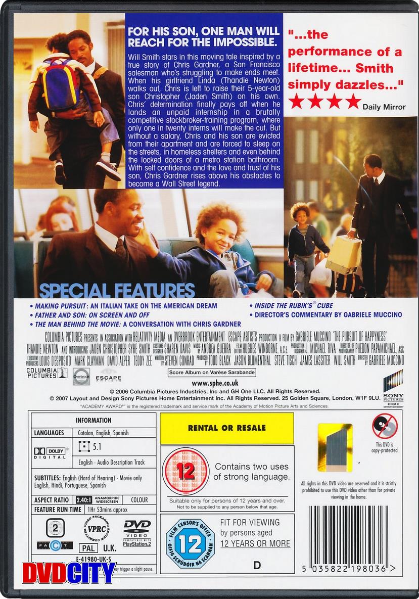 | Beskrivelse: [ Dansk Engelsk ] Det er den amerikanske drøm. Det er den menneskelige drøm. At man kan skabe sig en tilværelse, der er lykkelig for en selv og for sin familie. Chris Gardner har den drøm. Hans succes som sælger er begrænset, han bliver forladt af sin kone, han bliver sparket ud af sin lejlighed, og - værst af alt - han skal samtidig sikre sin femårige søn en tålelig tilværelse. Alligevel kaster han sin ud i at gennemgå en ulønnet uddannelse som mægler, hvor han i konkurrence med tyve andre kandidater kan se frem til en og kun en stilling i firmaet bagefter. Mens han trofast møder op i sin habit på jobbet hver dag, overlever han som han bedst kan med sin søn; sover på busstationer, på offentlige toiletter og - når de er heldige at få plads - på et herberg for hjemløse. Uden at lade det gå ud over sin søn satser Chris Gardner alt på at få sin drøm til at gå i opfyldelse. Beskrivelse: [ Dansk Engelsk ] For his son, One man will reach for the impossible. Will Smith stars in this moving tale inspired by a true story of Chris Gardner, a San Francisco salesman who's struggling to make ends meet. When his girlfriend Linda (Thandie Newton) walks out, Chris is left to raise their 5-year old son Christopher (Jaden Smith) on his own. Chris' determination finally pays off when he lands an unpaid internship in a brutally competitive stockbroker-training program, where only twenty interns will make the cut. But without a salary, Chris and his son are evicted from their apartment and are forced to sleep on the streets, in homeless shelters and even behind the locked doors of a metro station bathroom. With self confidence and the love and trust of his son, Chris Gardner rises above his obstacles to become a Wall Street legend. | Ekstra features: