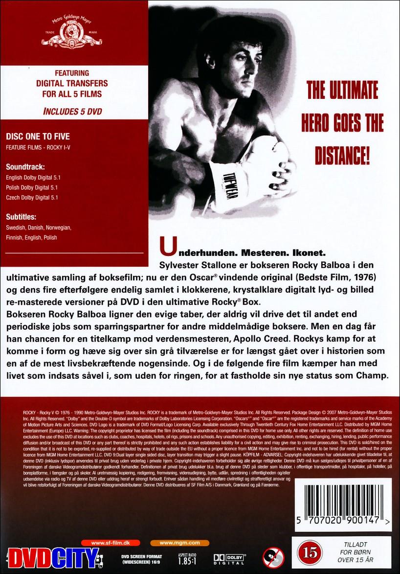 Rocky 5 (1990) Efter at Rocky er vendt hjem fra sin seneste triumf, opdager han, at alle hans penge er tabt af hans skruppelløse finansrådgiver. For at gøre det hele værre tvinger en kampskade Rocky til at stoppe karrieren. Så Rocky, hans kone Adrian og hans søn Rocky Jr. flytter til en billig lejlighed i det sydlige Philadelphia. Der må Rocky prøve at løsne op for den vrede, hans søn går rundt med. En bitterhed, der vokser, da Rocky begynder at træne en ung talentfuld bokser, Tommy Gunn, som hurtigt bliver landskendt. Men Tommy vender sig mod sin læremester - og Rocky bliver snart klar over, at han er nødt til at kæmpe endnu engang. Beskrivelse: [ Dansk Engelsk ] All six movies from the popular 'Rocky' franchise.