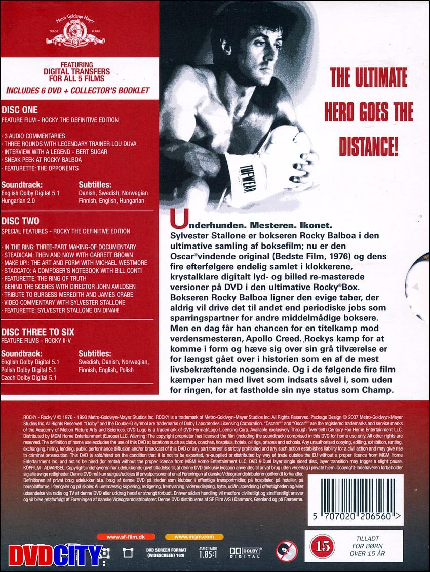 Rocky 5 (1990) Efter at Rocky er vendt hjem fra sin seneste triumf, opdager han, at alle hans penge er tabt af hans skruppelløse finansrådgiver. For at gøre det hele værre tvinger en kampskade Rocky til at stoppe karrieren. Så Rocky, hans kone Adrian og hans søn Rocky Jr. flytter til en billig lejlighed i det sydlige Philadelphia. Der må Rocky prøve at løsne op for den vrede, hans søn går rundt med. En bitterhed, der vokser, da Rocky begynder at træne en ung talentfuld bokser, Tommy Gunn, som hurtigt bliver landskendt. Men Tommy vender sig mod sin læremester - og Rocky bliver snart klar over, at han er nødt til at kæmpe endnu engang. Beskrivelse: [ Dansk Engelsk ] All six movies from the popular 'Rocky' franchise.